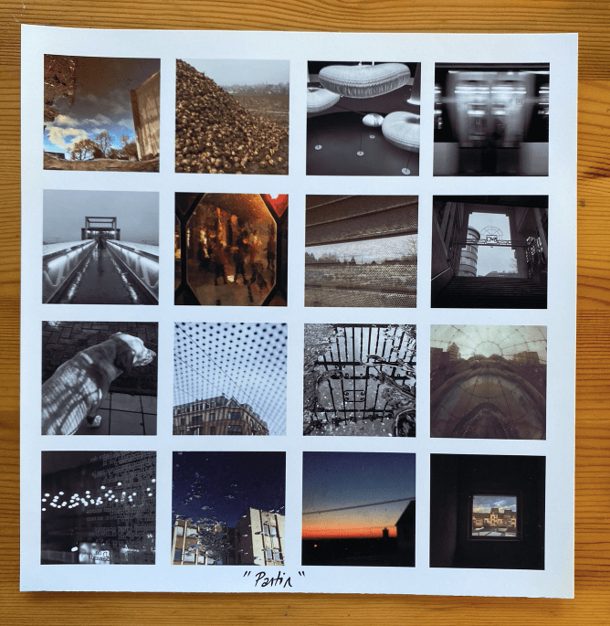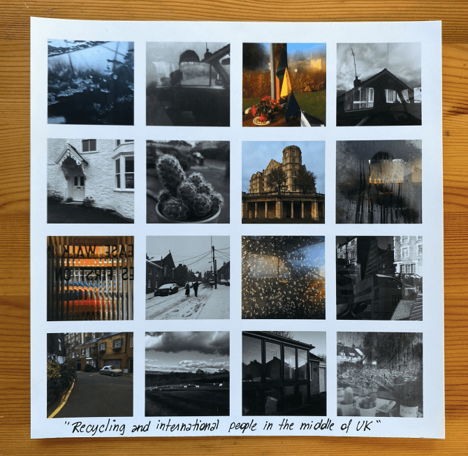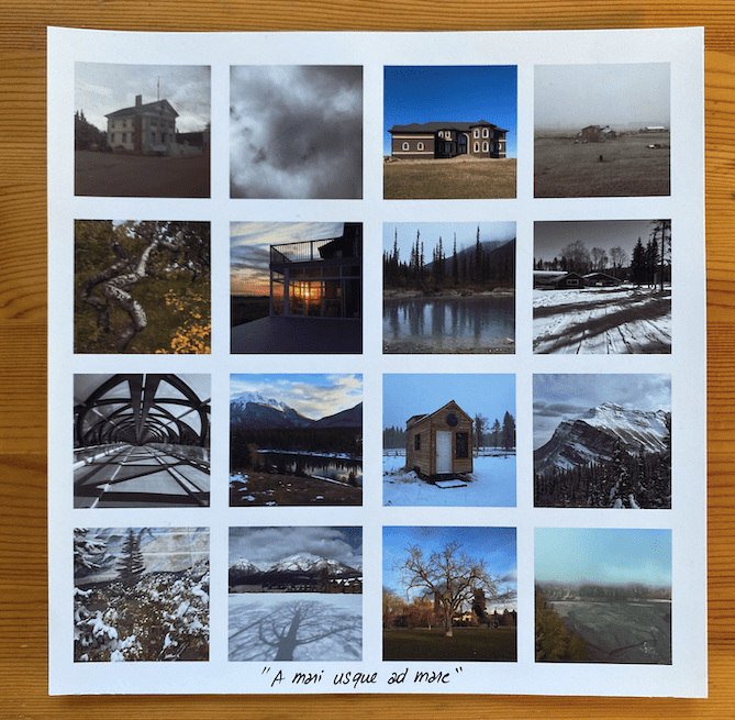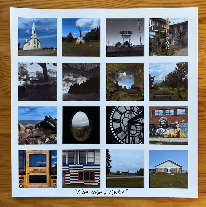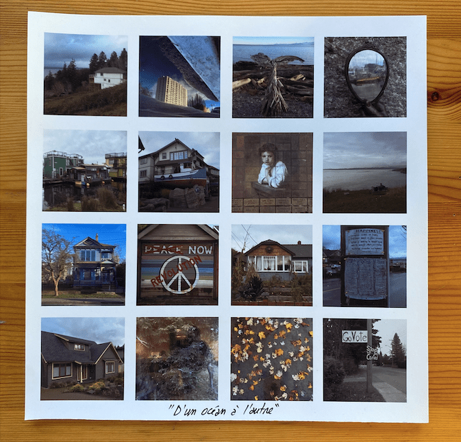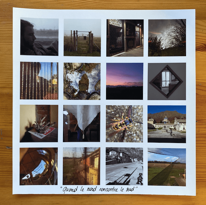 Un voyage dans une image carrée qui immortalise l’instant d’une journée dans le monde. Un mot, une phrase. C’est le bruit des images incessantes par lequel on est entourées dans la vie de tous les jours. Une multitude d’informations, dont on perd l’unité et le détail. Une chronologie des territoires traversés. Des instants de vie. Macro ou micro ? On garde une trace. On immortalise l’instant. Des souvenirs, des pensées. Un fil chromatique qui se poursuit dans l’image. Une langue liée à un territoire, des mots, des phrases qu’on entend, qui nous marquent : « La maison de lumière ». Et parfois, on n’a pas les mots.