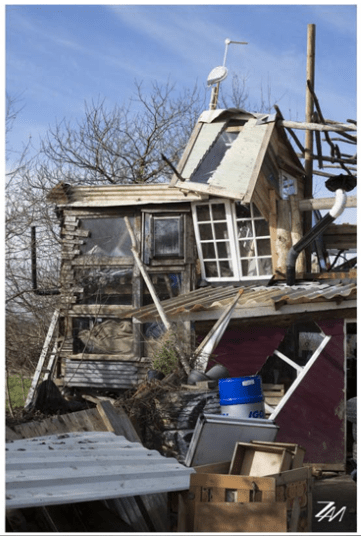 La photographie est souvent interdite dans ces territoires, plus particulièrement les photographies de portraits. C’est d’ailleurs mentionné par un logo de caméra barrée ou parfois même de manière plus extrême par une caméra à l’état de ruine à l’entrée de la zone et des cabanes. Apprivoiser ces anticapitalistes, faire patte blanche et s’intégrer à leur communauté est compliqué quand le photographe est souvent associé à l’image de l’autorité et du contrôle. J’ai malgré tout eu l’occasion de les rencontrer et, avec leur autorisation, de photographier une de leurs cabanes, que ces militants ont eu l’occasion de construire avec des matériaux de récupération. Il y a aussi cette route ciselée par les tracteurs.